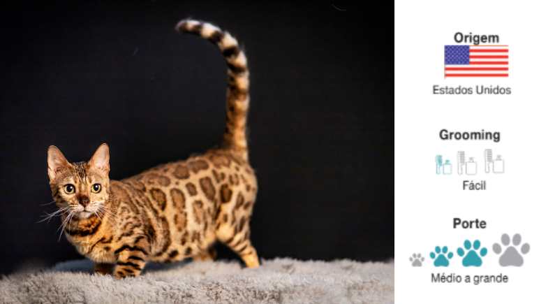 Particularidades: É o único felino doméstico a exibir rosetas iguais às das jaguatiricas e dos leopardos na pelagem.