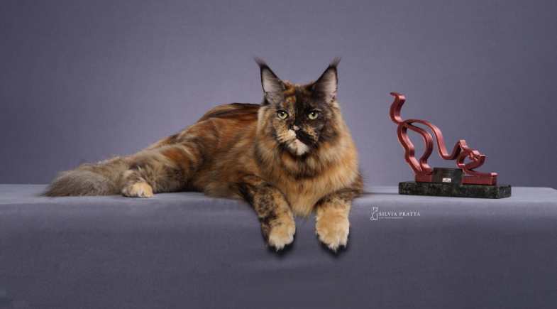 Maine Coon fêmea criada por Glória, da coloração black tortie blotched: ela recebeu o título de campeã das Américas no American Winner 2025