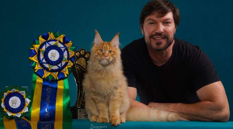 Eder com Édipo Quarto, Maine Coon brasileiro que foi para a final do Campeonato Mundial e campeão das Américas no American Winner 2025