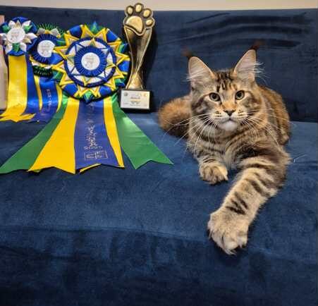 A boa notícia é que o cenário nacional se tornou muito mais profissionalizado. “Quanto à estrutura geral, a qualidade da raça cresceu, aproximando o Brasil dos principais polos internacionais”, afirma Fernanda. “A evolução da raça por aqui foi bastante alta. Eu, por exemplo, importei vários gatos campeões em exposições e os cruzamentos entre eles deram certo, nascendo uma belíssima genética. E vi isso acontecer com vários outros criadores. Hoje temos ótimos gatis da raça no País, que fazem um trabalho muito sério e, entre os novos, há alguns que inclusive procuraram gatos comigo, ou seja, já com esta genética mais trabalhada e, assim, eles entraram na criação com exemplares bons, o que é fundamental”, conta Eder. “Há de fato gatis muito bons no Brasil hoje em dia”, comenta Glória. “Existem realmente criadores da raça em nosso país com gatos de excelência na genética”, confirma Letícia. Eder acrescenta: “Não à toa, na Exposição Mundial da Fédération Internationale Féline (FIFe) de 2025, realizada em outubro na Romênia, dois exemplares da raça de criação brasileira foram nominados para a final na categoria kittens (filhotes). Um deles, Monte Olimpo Édipo, nasceu no meu gatil e permanece sendo de minha propriedade”. Ser nominado para a final de uma Exposição Mundial consiste em disputar o Best in Show, título dado ao melhor gato em sua categoria (na FIFe há quatro existentes, sendo que a do Maine Coon é voltada para raças de pelagem semilonga, caso também do Norueguês da Floresta, do Siberiano, etc.) e de sua divisão (na FIFe elas são as seguintes: machos adultos não castrados; machos adultos castrados; fêmeas adultas não castradas; fêmeas adultas castradas; filhotes, de 4 a 8 meses; juniors, de 8 a 12 meses). Após tal classificação, o exemplar se junta a outros gatos também convocados. Então, cada um dos juízes presentes vota em um deles: o mais votado recebe o Best in Show.