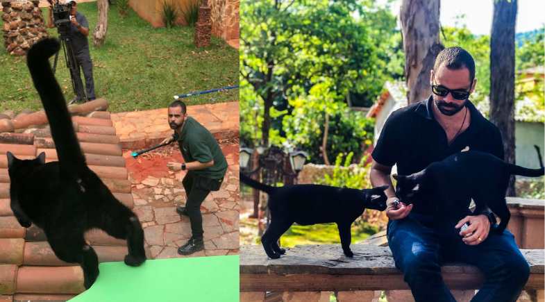 Anderson Gonsales, o encantador de gatos brasileiro, e gato Léon (raça Bombay), da novela “O Sétimo Guardião”, que foi
